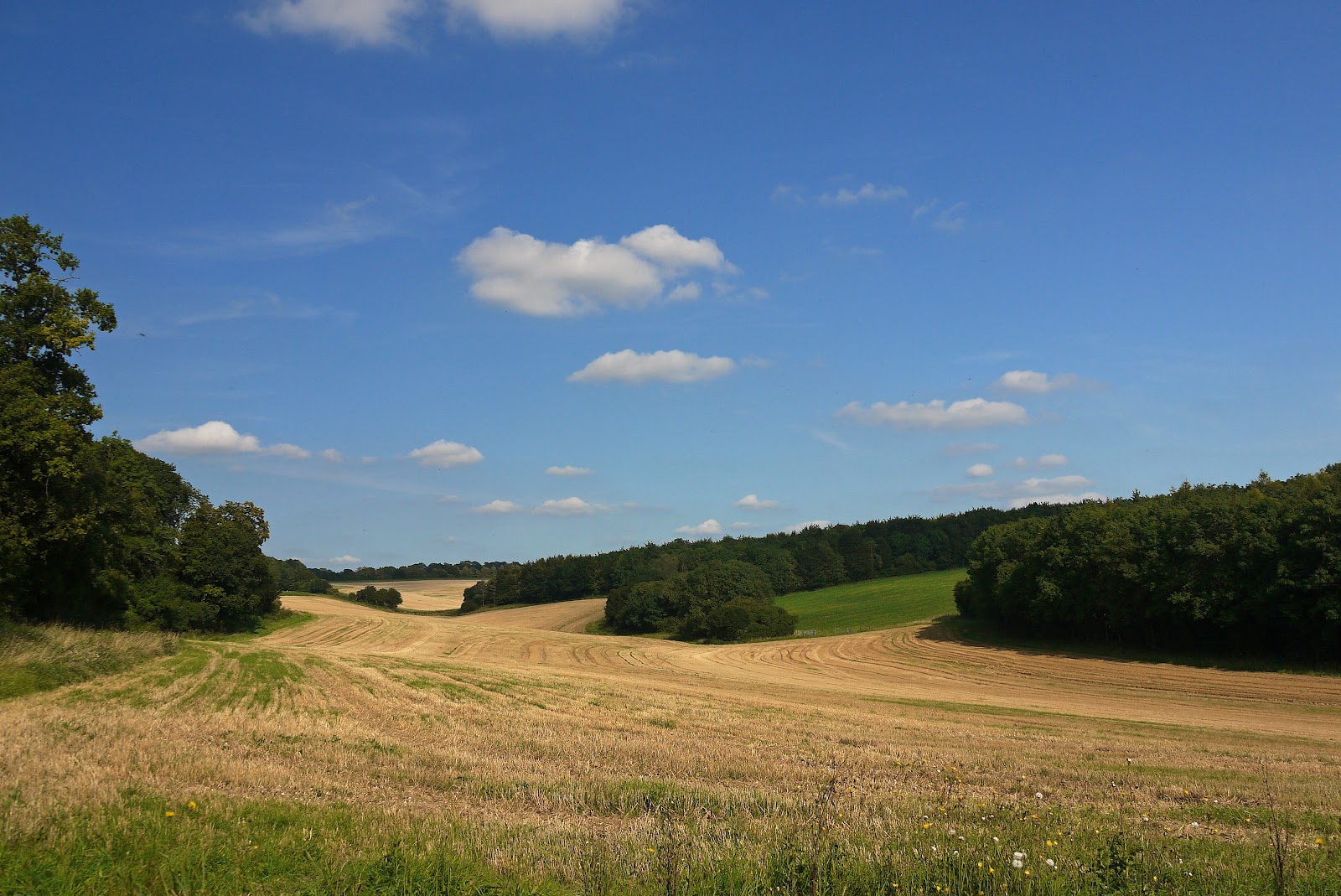 There seem not to have been many opportunities to walk lately, with our strangely busy social life and the uncertain weather, but today offered a chance to get out so I returned to the Wayfarer's Walk for the first time since June 16. I picked up the route at Wind Farm and followed a field-edge track shared with the South Downs Way to Lomer Farm, where the Wayfarer's Walk turned off to the south. It's all agricultural land here, but the view east (above) was very pleasant.
